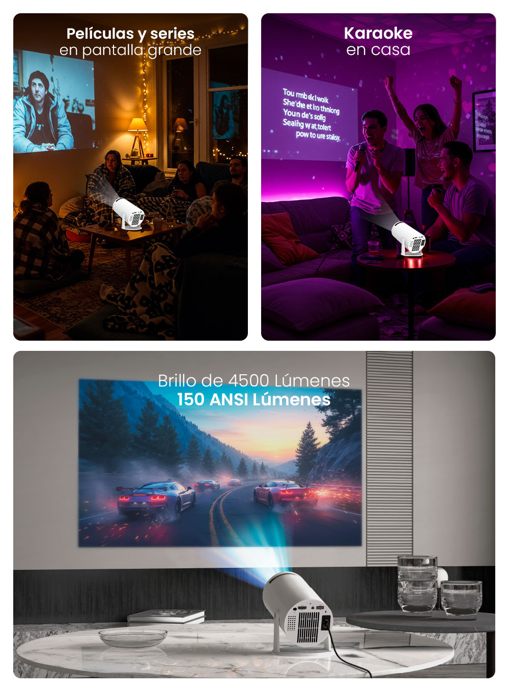 Disfruta de tus contenidos en resolución HD 4K y 1080p, con colores vibrantes y un brillo potente ajustable. Vive la emoción del cine sin pagar boletos ni comprar una pantalla gigante. Perfecto para noches familiares, maratones de series, partidos o videojuegos con amigos.